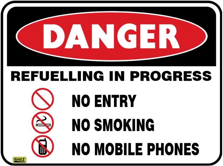 SIGN Danger Refuelling in Progress No Entry, No Smoking, No Mobile Phones 600 x 450mm Powdercoated Metal
