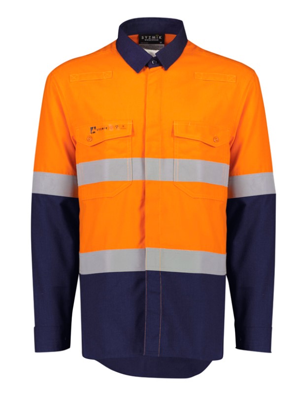 SYZMIK Mens Orange Flame Lightweight Ripstop Spliced HRC2 Shirt Hoop Taped 165gsm L/S